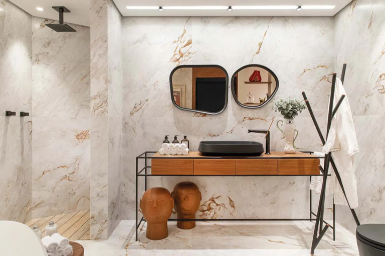 O mármore é uma escolha comum para banheiros, graças à sua aparência sofisticada e variedade de cores. Ele traz um toque clássico e luxuoso ao ambiente, mas exige mais cuidados em comparação com outras opções, especialmente em áreas de uso constante, como a cozinha.